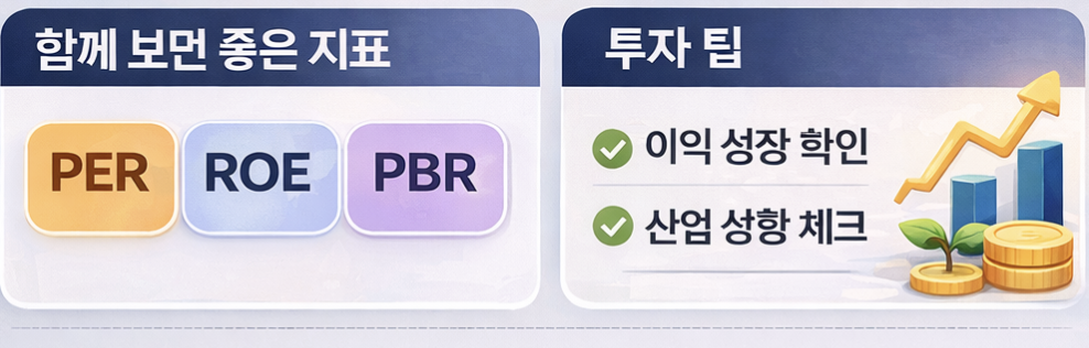 투자에서는 PER 하나만 보는 것보다 다른 재무 지표를 함께 확인하는 것이 중요합니다. 대표적으로 많이 함께 보는 지표는 다음과 같습니다.